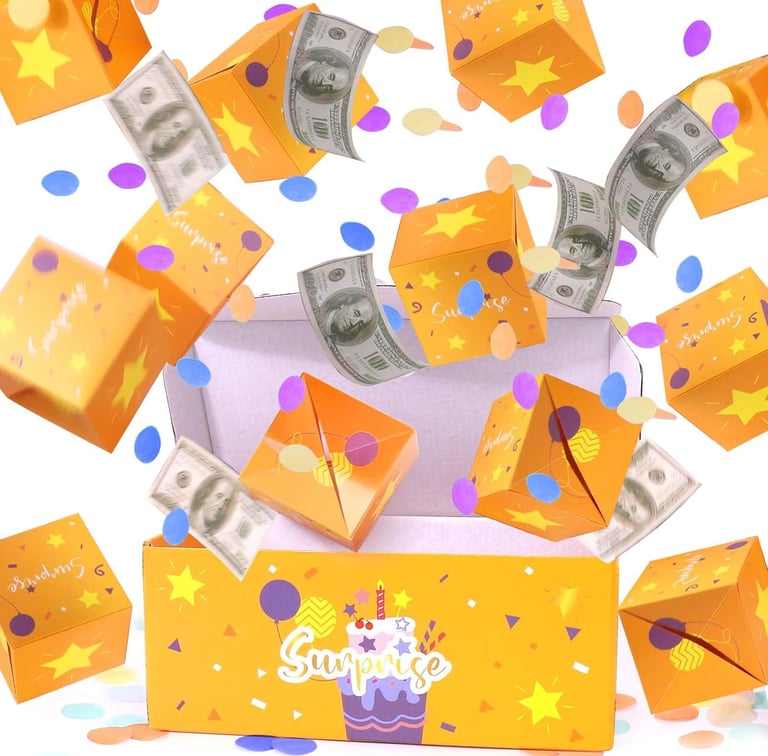 Turn a simple cash gift into an unforgettable moment with the BABORUI Birthday Money Explosion Surprise Gift Box. Designed to create instant excitement, this clever box bursts open with confetti, bouncing mini boxes, and hidden cash surprises. It’s easy to set up in just one minute and reusable for future celebrations. Perfect for birthdays, parties, or surprise moments, it works for women, men, and kids of all ages. Add money, photos, cards, or small notes to make it personal. When the box opens, laughter, shock, and joy are guaranteed—making memories far more valuable than money alone.