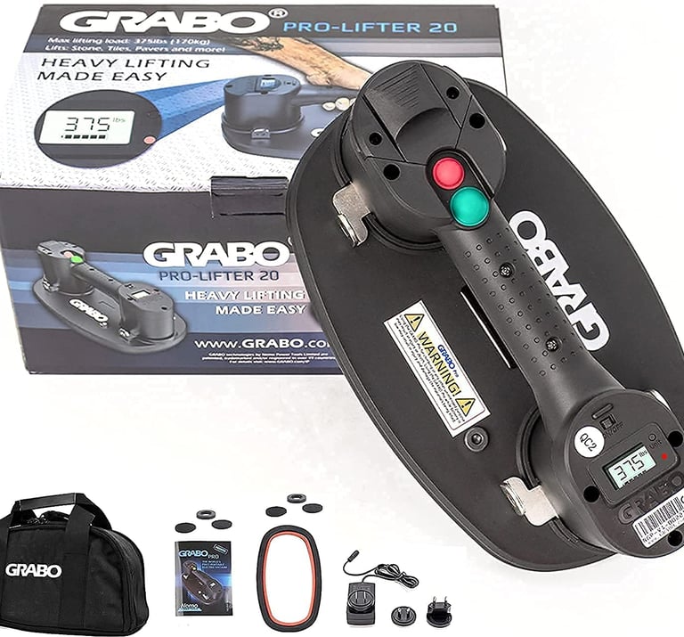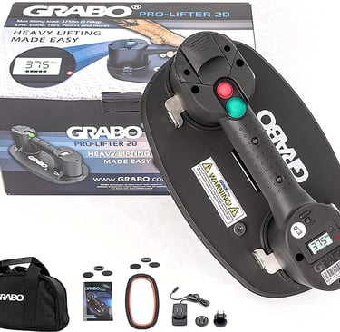 The GRABO Pro-Lifter-20 is a professional-grade electric vacuum suction cup lifter engineered to make lifting heavy, flat materials easier and safer than traditional manual suction cups. With its powerful vacuum pump and intelligent pressure monitoring, it creates a strong suction seal that can handle large tiles, panels, glass, wood, stone, and other materials with high reliability. Designed to lift up to around ⚙️ 375 lbs (≈170 kg) with automatic pressure control and a digital display for safety, this lifter is ideal for construction, renovation, installation, and workshop tasks. Lightweight and battery-powered, it’s a versatile tool that enhances productivity and reduces strain on the job.