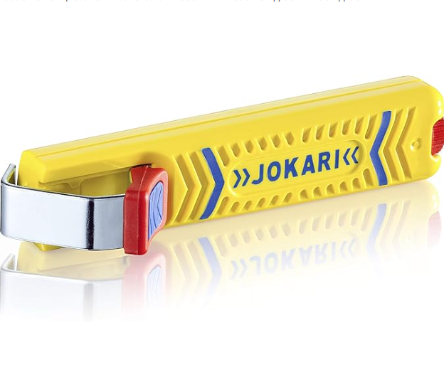 The Jokari 10270 Secura Cable Stripping Knife is a professional-grade tool designed for fast, clean, and safe stripping of standard round cables. Made in Germany, it features a premium Titanium-Nitride (TIN) coated blade that delivers longer life, smoother cuts, and reduced wear even with frequent use. The ergonomic slip-proof handle with a soft thumb protector ensures excellent control and comfort during demanding jobs. A spare TIN-coated blade is conveniently stored inside the handle, minimizing downtime. Ideal for electricians, automotive installers, and workshop professionals, this knife offers reliable performance, precision, and durability in one compact, trusted tool.
