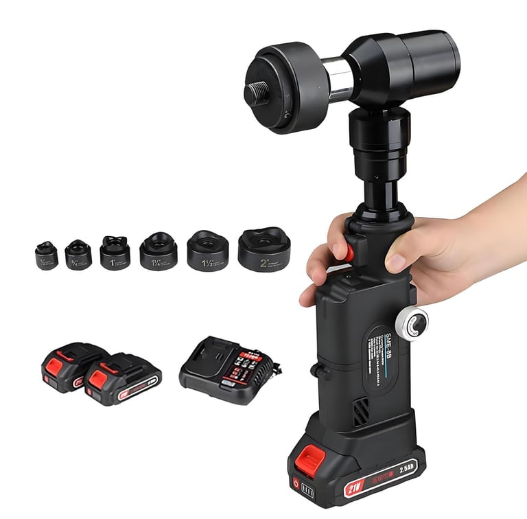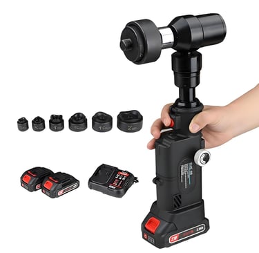 The SICWEDIM cordless hydraulic punch tool delivers industrial-grade performance for clean, precise metal hole punching. Powered by a robust 21V rechargeable battery system, it generates up to 80KN of hydraulic force with a smooth 22mm stroke, ensuring effortless operation on demanding job sites. Designed for accuracy, it punches Q235 steel up to 2mm thick and stainless steel up to 1mm thick without deformation. The automatic pressure relief system enhances safety and tool longevity, while six hardened alloy steel dies provide flexibility across multiple hole sizes. Ideal for metal fabrication, electrical enclosures, and automotive work, this tool combines power, mobility, and professional reliability.