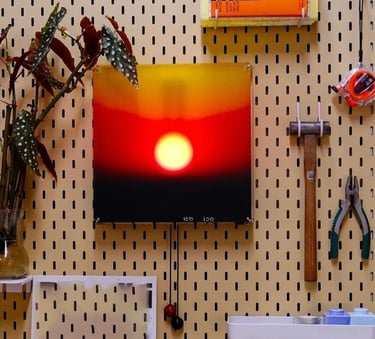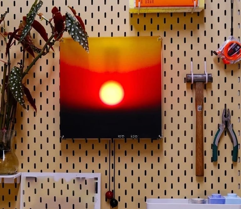 Bring your walls to life with the Kinetic Sunrise Lamp, a stunning wall light that mimics the movement of the sun. Designed with a manual pull cord, this lamp lets you adjust the sun’s “position” to create your own sunrise or sunset glow. Perfect for cozy evenings or artistic interiors, it adds a warm ambient light and a funky modern touch to any room. Ideal for bedrooms, studios, or creative spaces — this lamp transforms lighting into an interactive, meditative experience. A truly unique mood light for those who love design that moves with emotion.