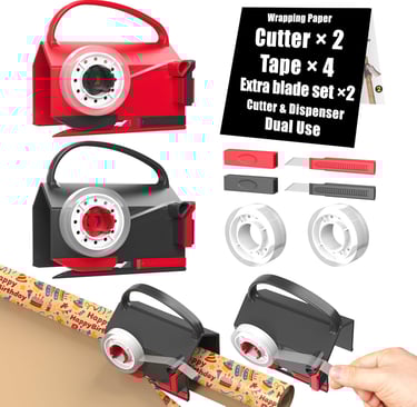 Make your holiday wrapping effortless with the (2-Pack) Wrapping Paper Cutter & Tape Dispenser, your all-in-one solution for neat, quick, and stress-free gift wrapping. This smart tool combines a paper roll holder, sliding cutter, and tape dispenser in one compact design — perfect for Christmas, birthdays, and holidays. The sharp replaceable blades ensure clean cuts, while the built-in tape holder keeps everything within reach. Its safe, ergonomic grip makes wrapping faster and safer than scissors. Ideal for craft lovers, families, and busy holiday packers who want perfectly wrapped presents every time with minimal effort!