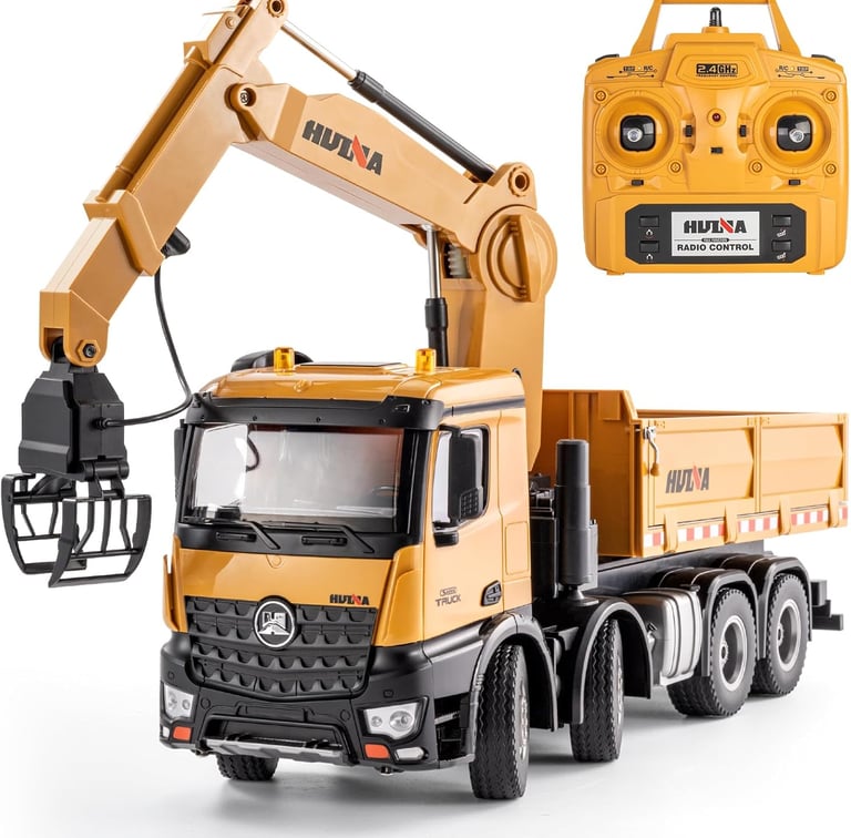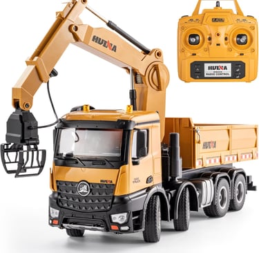 The YAZHIYI 26CH Remote Control Dump Truck is a powerful, feature-packed construction vehicle designed for serious play and realistic operation. Built at a detailed 1/14 scale, it combines durable ABS plastic with metal components for a heavy-duty feel. This 4-in-1 RC truck features a functional wood grabber arm and a sturdy metal dump carriage, allowing for multiple construction scenarios in one model. With 26-channel control, bright LED headlights, and rubber tires for stable driving, it performs smoothly indoors and outdoors. Two rechargeable batteries provide over 60 minutes of playtime, making it an excellent gift for kids, teens, and adults who love realistic RC construction machines.