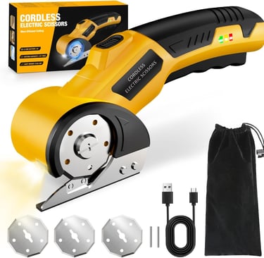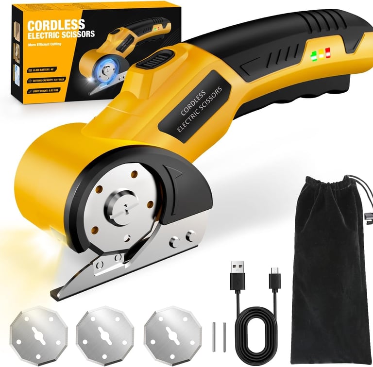 The Zeleki Cordless Electric Scissors are a smart, time-saving tool designed for effortless cutting at home or in DIY projects. Powered by a 4V rechargeable battery, this lightweight cutter handles cardboard, fabric, carpet, plastic, and leather with clean, controlled precision. It comes ready to use with one installed blade plus two replacements, ensuring long-lasting sharpness. The ergonomic anti-slip grip reduces hand fatigue, while the dual safety lock system prevents accidental activation. Built-in LED lighting improves visibility in low-light areas, making every cut safer and more accurate. Ideal for crafts, recycling boxes, home décor, and everyday cutting tasks.